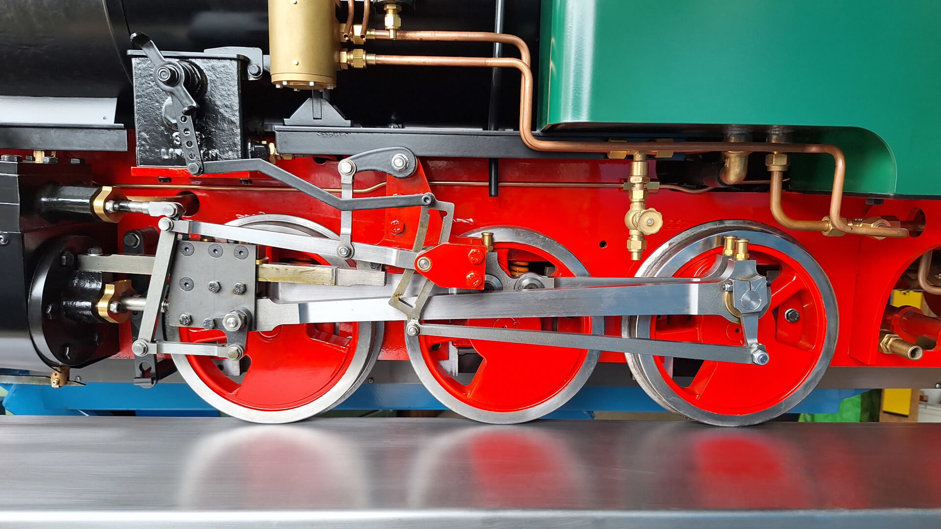 The repositioning of the blowdown nozzle, pointing to the left, grants a more comfortable access for putting the water hose on when filling the boiler with water. It also allows blowing down while running without lifting ballast and dirt up from the track into all the inaccessible crevices and corners of the locomotive frame.