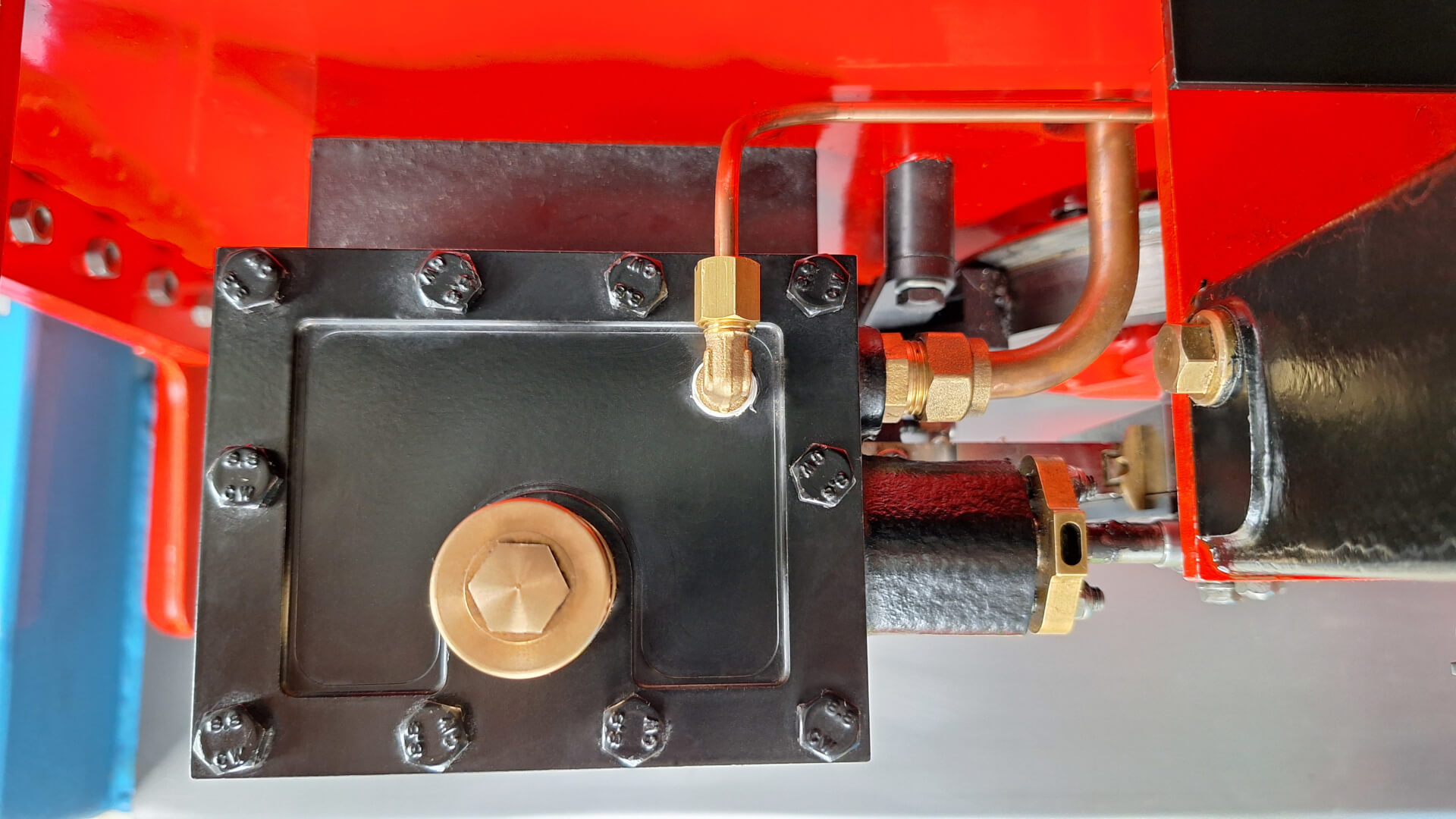 The repositioning of the blowdown nozzle, pointing to the left, grants a more comfortable access for putting the water hose on when filling the boiler with water. It also allows blowing down while running without lifting ballast and dirt up from the track into all the inaccessible crevices and corners of the locomotive frame.